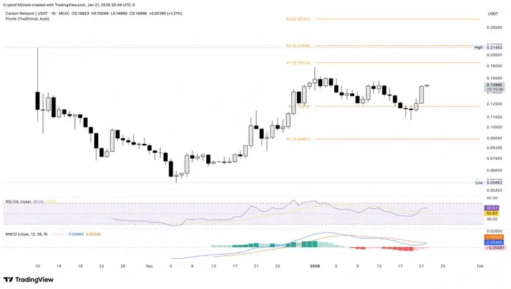 Los controles de privacidad configurables de Canton Network lo convierten en una de las adopciones institucionales de capa 1 favoritas, incluyendo la tokenización de los activos custodiados por la Depository Trust Company (DTC) y la integración de su moneda JPM por JP Morgan para liquidaciones. En el momento de escribir, Canton cotiza cerca de 0.15$ el jueves, tras el salto del 18% del día anterior. El rebote en CC esta semana representa aproximadamente un 25% de ganancias hasta ahora, con los toros apuntando al Punto de Pivote R1 en 0.1859$.