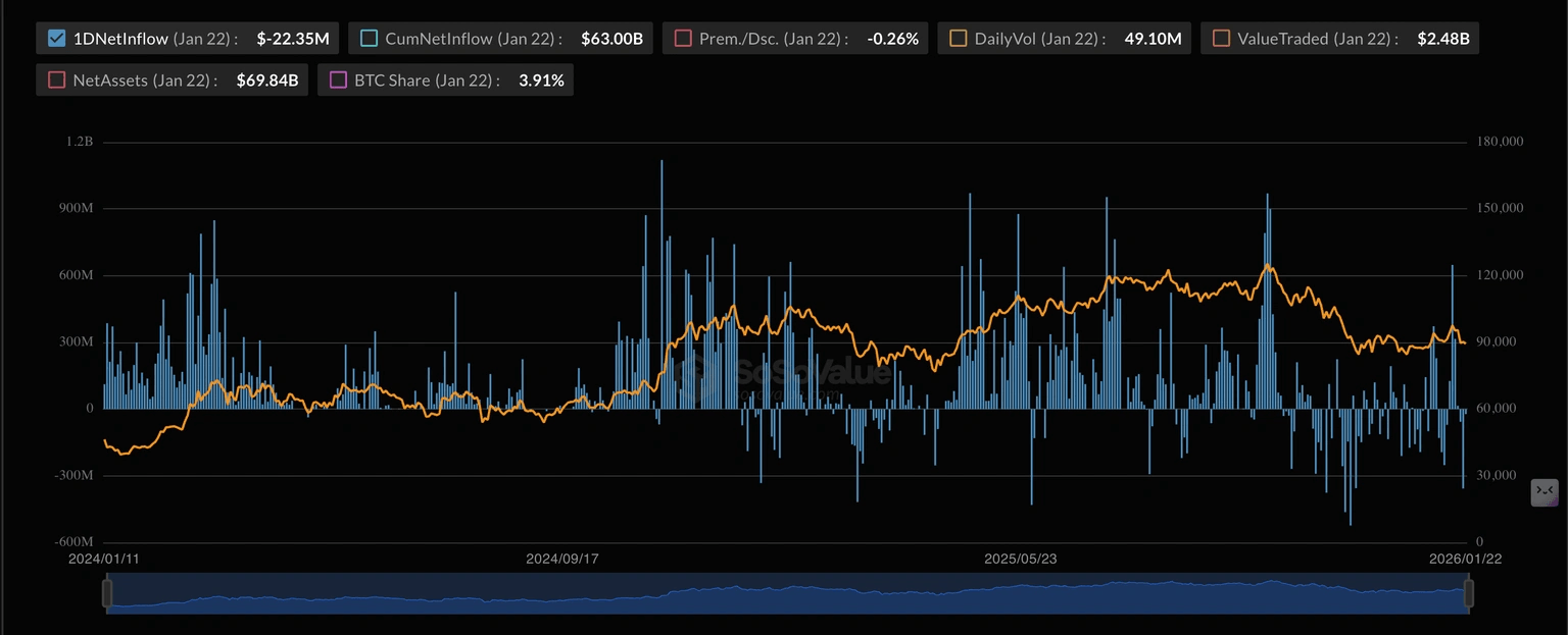 Bitcoin (BTC) está operando por debajo de 90.000$ en el momento de escribir el viernes, con una caída de casi el 5% esta semana. A pesar de una breve mejora en el apetito de riesgo tras el discurso a mitad de semana del presidente de EE. UU., Donald Trump, en Davos, que puso fin a la imposición de nuevos aranceles a las naciones europeas en respuesta a su oposición a la compra de Groenlandia por parte de EE. UU., el Rey Cripto sigue bajo presión a medida que la demanda institucional continuó debilitándose hasta ahora esta semana.