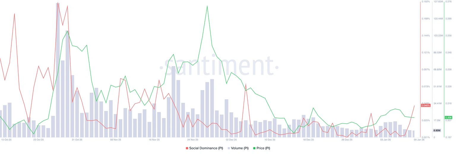 Pi Network (PI) cotiza cerca de 0.2100$ en el momento de la prensa el viernes, estabilizándose tras una caída de dos días de casi el 2%. El volumen de comercio del token PI disminuye constantemente, mientras que un aumento en el dominio social sugiere un posible aumento en el interés minorista. Las perspectivas técnicas para PI siguen siendo mixtas a medida que las Bandas de Bollinger se comprimen, sugiriendo una ruptura en cualquiera de los lados.