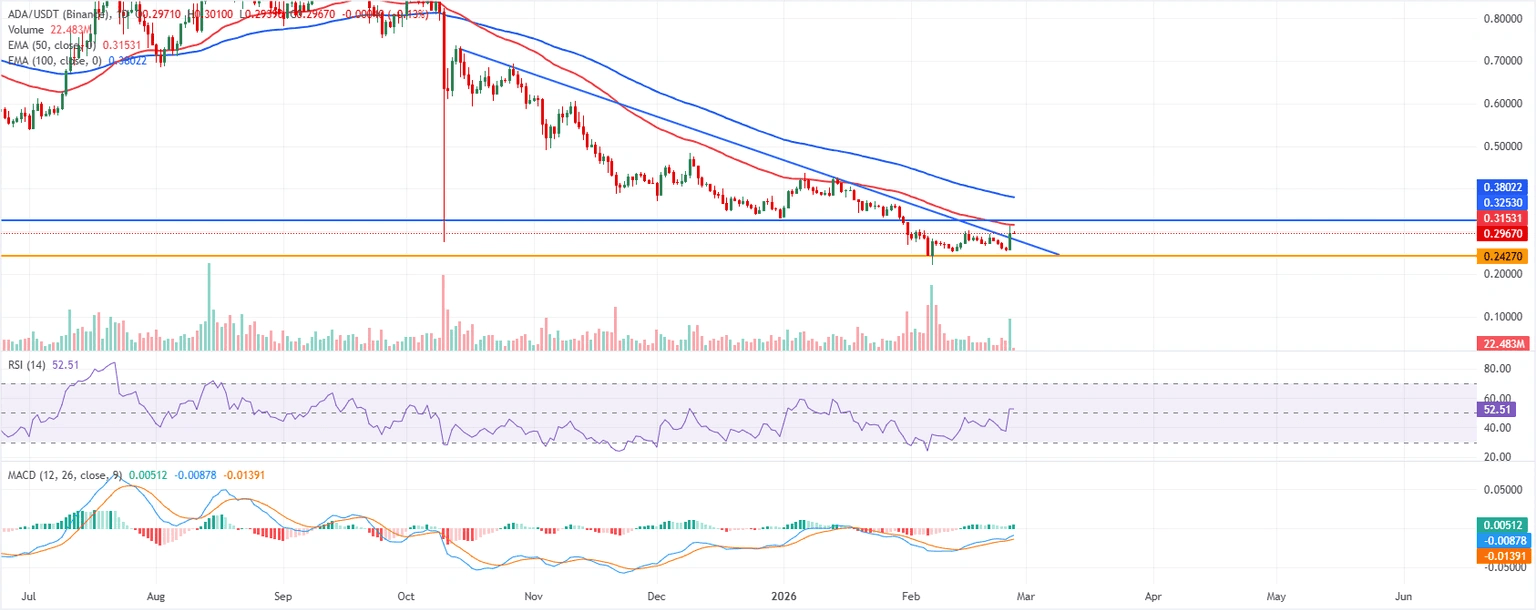 El mercado de Cardano registró una silenciosa entrada de capital en los últimos seis meses que solo ahora comienza a reflejarse en el precio. Las direcciones con tenencias de un millón de dólares acumularon más de 819 millones de tokens ADA mientras el mercado permanecía en una fase correctiva. Esa acumulación precedió al repunte del 14% que empujó el activo a 0.30$ el 25 de febrero.