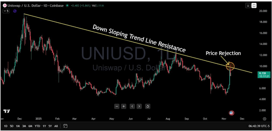 Uniswap (UNI), el token nativo del principal protocolo de intercambio descentralizado, acaba de entregar uno de esos momentos cruciales que hacen que los operadores técnicos se fijen y presten atención. Después de un poderoso rally desde los mínimos de 5.00$ a finales de octubre, UNI se lanzó directamente hacia un formidable obstáculo: una línea de tendencia de resistencia descendente que ha estado limitando el alza desde que el token alcanzó su punto máximo cerca de 20.00$ a principios de este año.