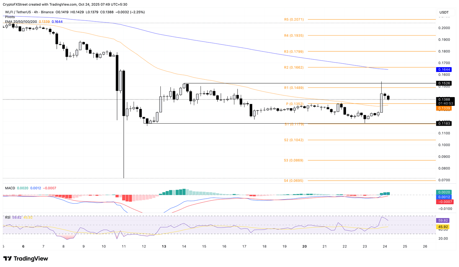 World Liberty Financial se mantiene estable por encima de 0.1350$ en el momento de escribir el viernes, tras un aumento del 16% el día anterior. El token WLFI está cotizando en un rango lateral entre la línea base de 0.1183$ y el techo de 0.1526$ en el gráfico de 4 horas.