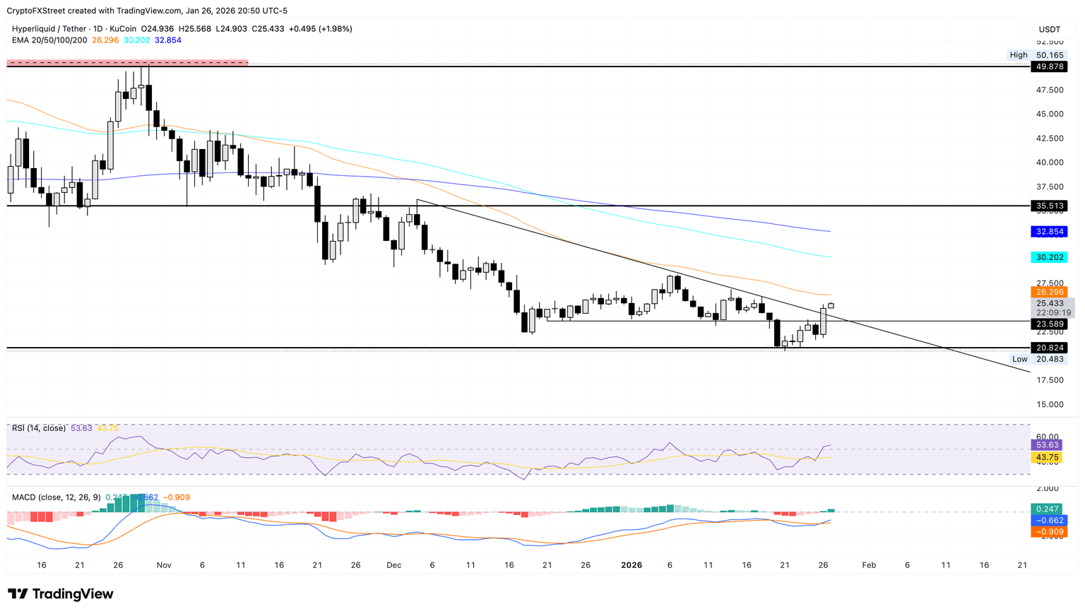 Hyperliquid sube un 2% al momento de la publicación el martes, extendiendo las ganancias del 12% del día anterior. El rebote del token HYPE se acerca a la media móvil exponencial (EMA) de 50 días en 26.29$, que sigue por debajo de las EMAs de 100 y 200 días, proyectando un sesgo bajista.