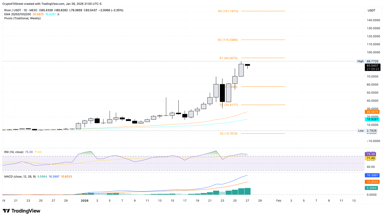 - River se mantiene por encima de 83$ tras el rally del 21% del lunes, acumulando más de un 600% de ganancias hasta ahora en enero.