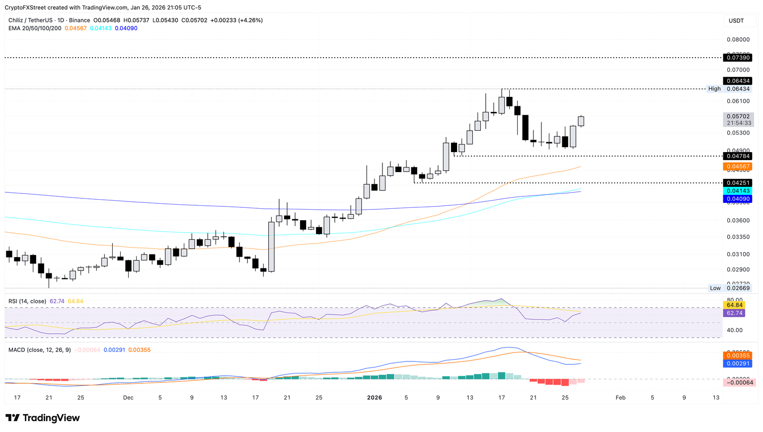 La recuperación en CHZ probablemente pondrá a prueba el pico de 0.064$ del 17 de enero, y un cierre decisivo por encima de este abriría la puerta hacia el nivel de 0.073$, marcado por el mínimo del 20 de diciembre.