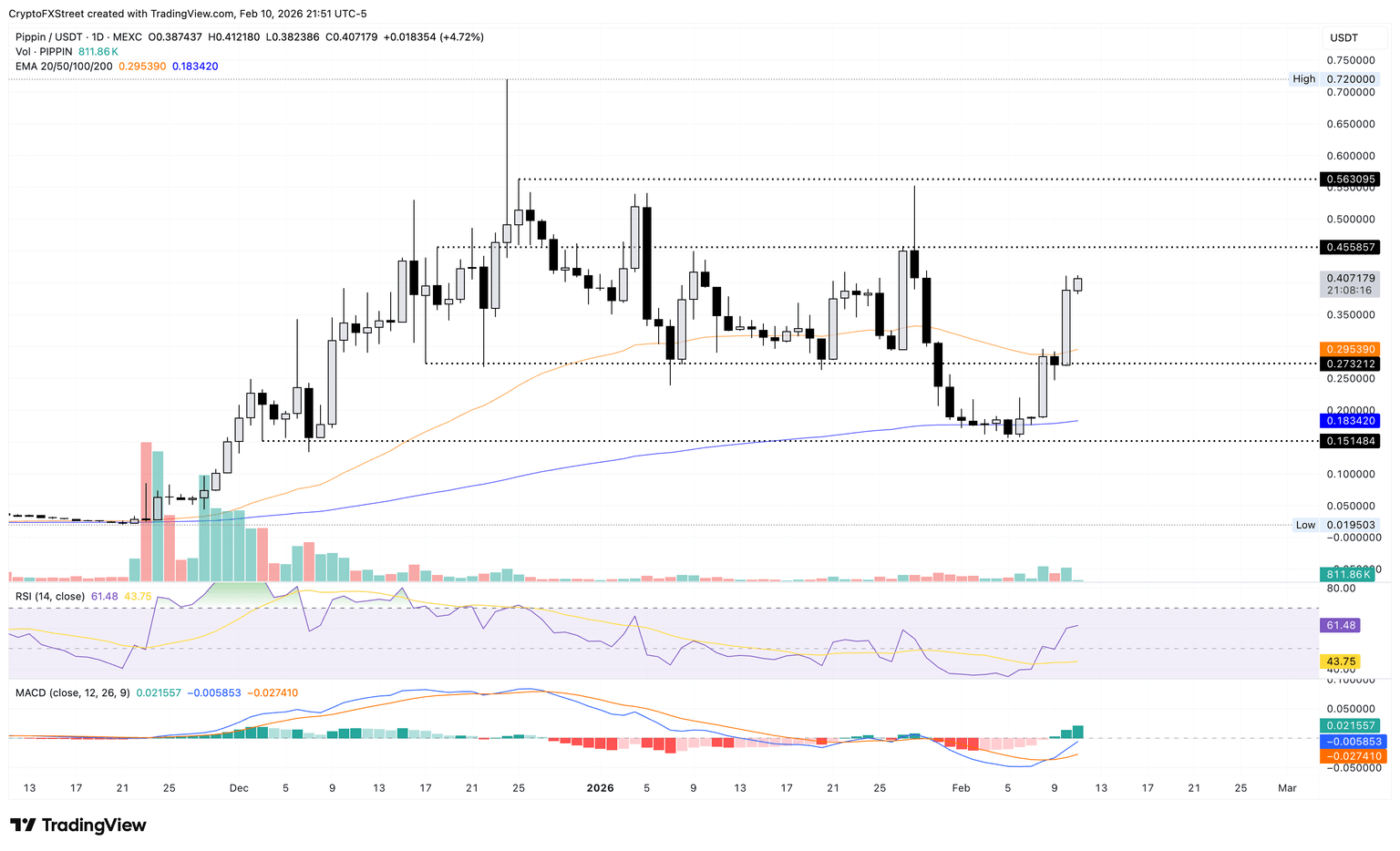 PIPPIN ha subido aproximadamente un 40% hasta ahora esta semana, extendiendo sus ganancias del 55% de la semana anterior. En el momento de escribir, PIPPIN ha subido casi un 5% el miércoles, acumulando ganancias sobre su rally del 43% del día anterior.