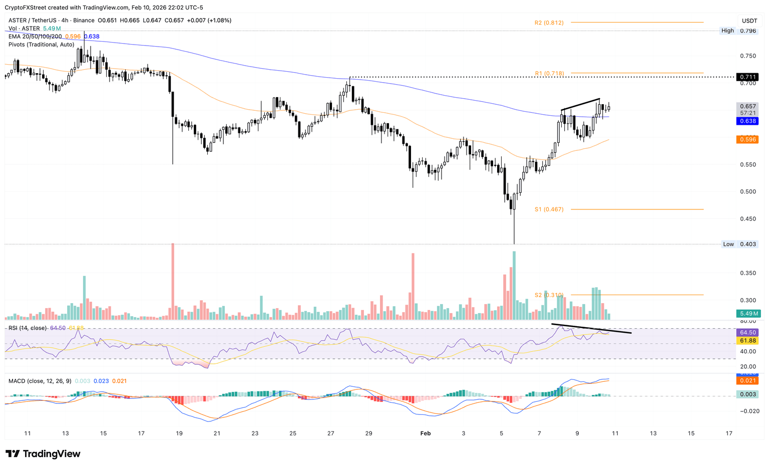 El RSI en 64 indica una intensa presión de compra, mientras que el MACD y la línea de señal permanecen en una tendencia ascendente por encima de la línea cero. Sin embargo, el RSI en pendiente descendente señala una divergencia bajista a medida que Aster forma un máximo más alto, mientras que el histograma del MACD en contracción indica un riesgo de un cruce bajista.