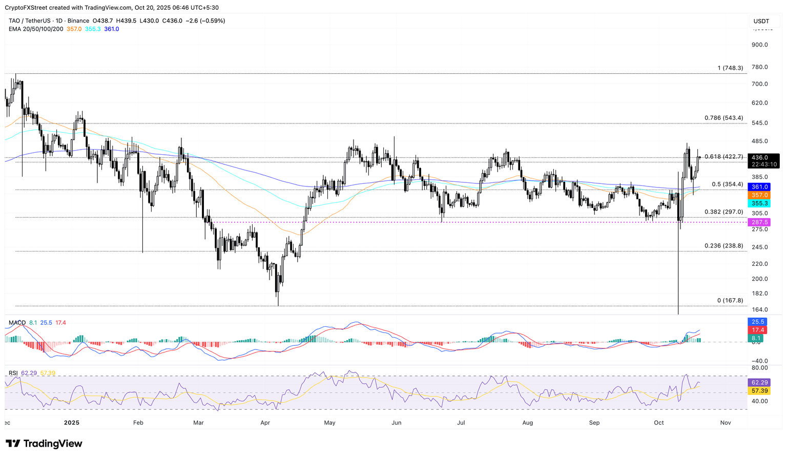 - Bittensor rebota desde la EMA de 200 días para recuperar los 400$ mientras el impulso alcista se mantiene estable.