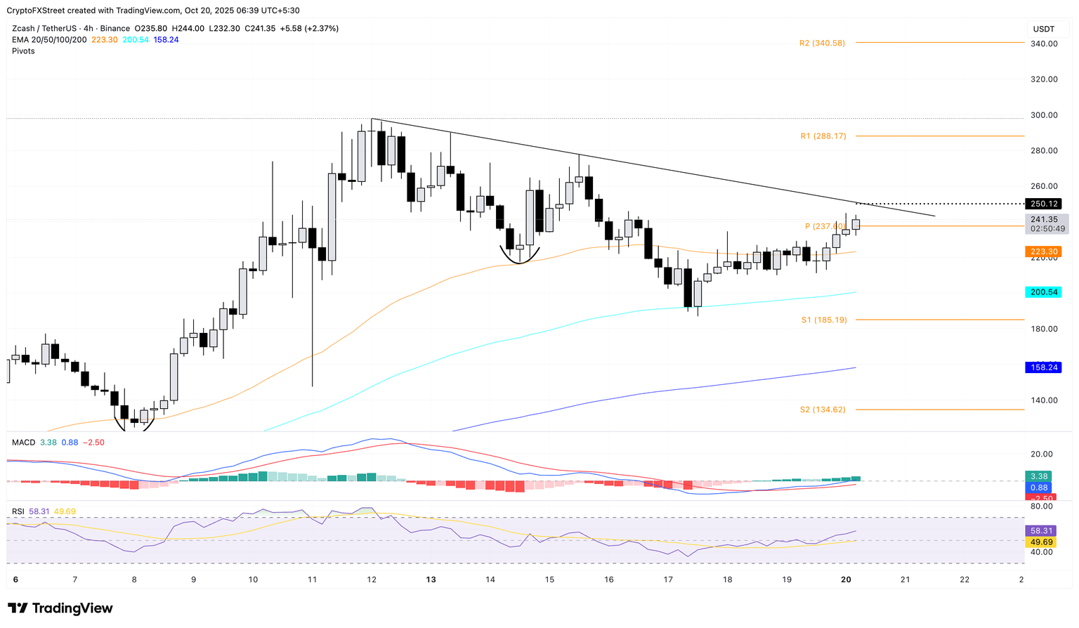 Zcash toma un respiro tras tres días consecutivos de tendencia alcista, lo que marca una recuperación en forma de V en la moneda de privacidad. ZEC cotiza por encima de 240$ en el momento de la redacción, acercándose a una línea de tendencia de resistencia local en 250$ en el gráfico de 4 horas, formada al conectar los picos del 11 y 13 de octubre.
