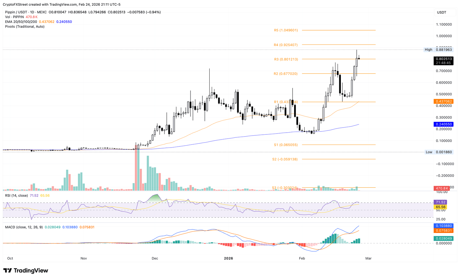 - Pippin se mantiene estable por encima de 0.80$ el miércoles después de un rally de cuatro días, contabilizando aproximadamente un 70% de ganancias.
