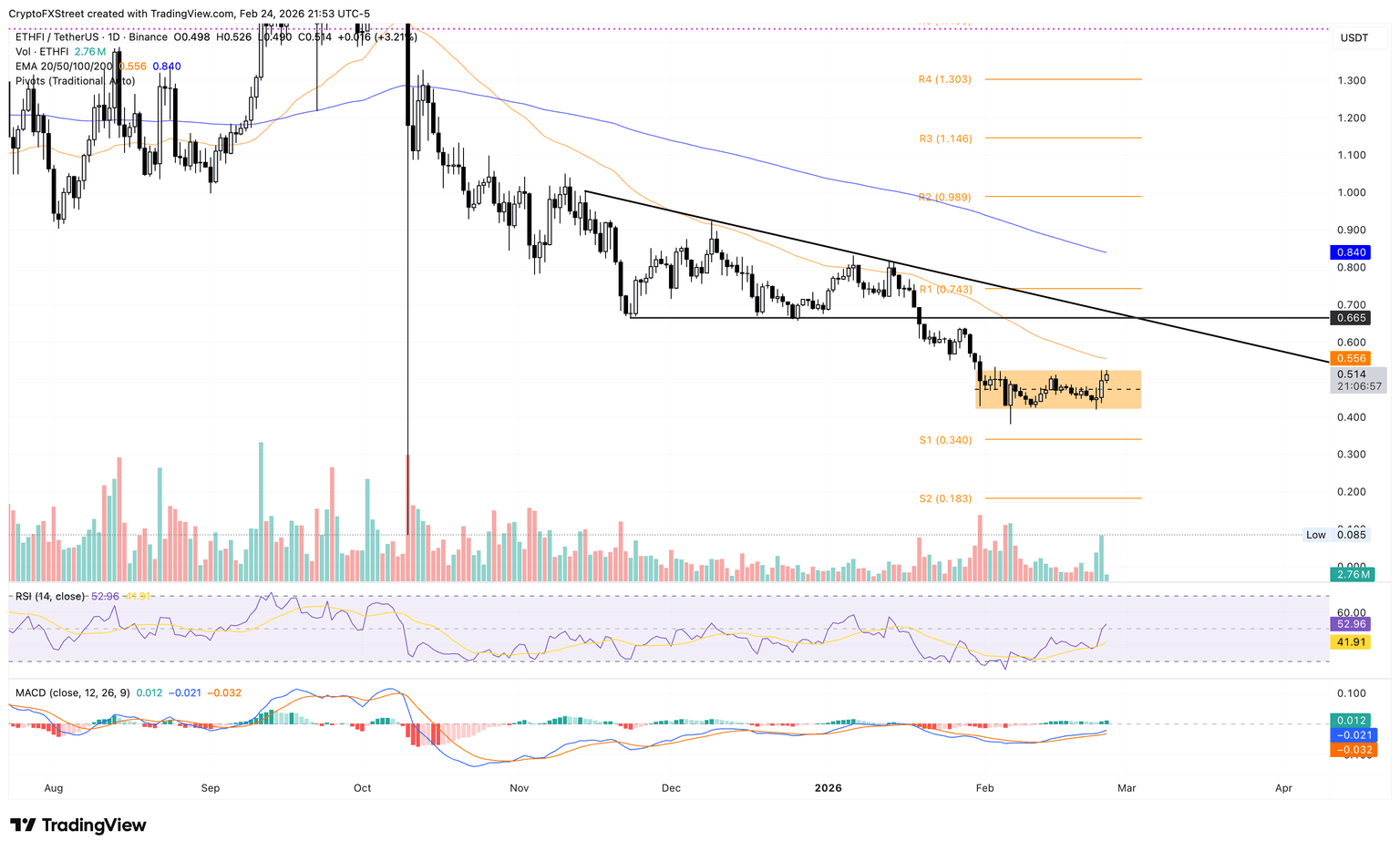 ETHFI sube un 3% por encima del nivel psicológico de 0.500$ al momento de escribir el miércoles, extendiendo las ganancias por tercer día consecutivo. La recuperación se acerca a la resistencia superior de una consolidación a corto plazo que va de 0.420$ a 0.527.