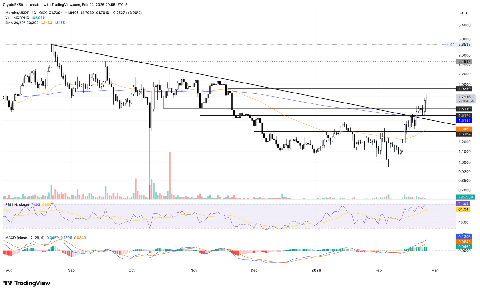Morpho extiende la recuperación tras la ruptura de una línea de tendencia de resistencia en el gráfico logarítmico diario, conectando los máximos del 22 de agosto y del 13 de noviembre. Al momento de escribir, Morpho sube un 3% el miércoles, extendiendo el rebote del 10% desde la media móvil exponencial (EMA) de 200 días del día anterior.