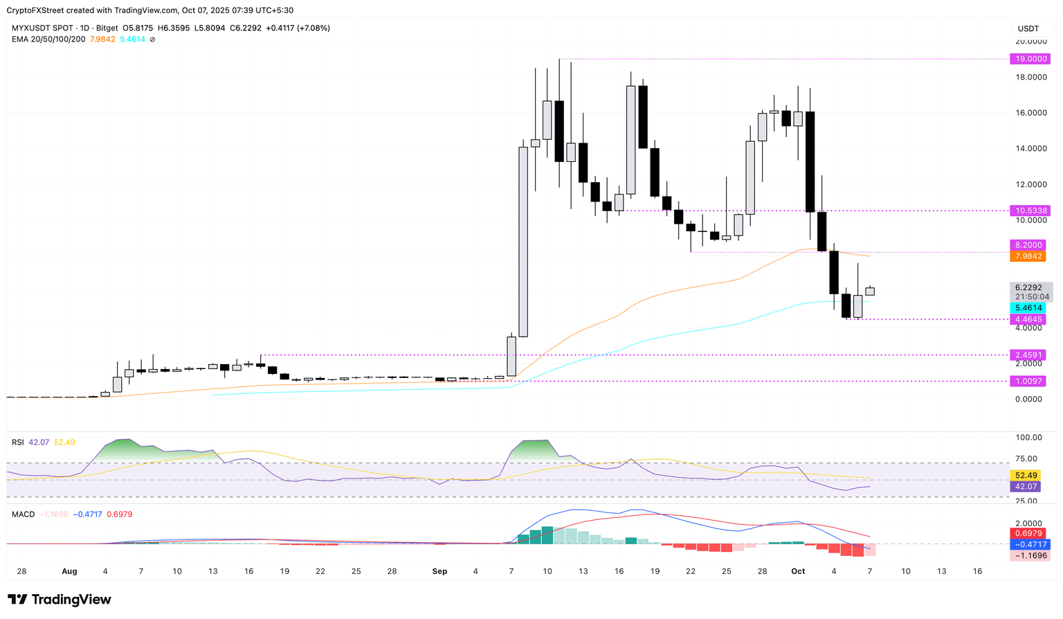 MYX Finance sube un 7% en el momento de la publicación el martes, extendiendo el aumento del 27% del día anterior. El segundo día consecutivo de recuperación en MYX apunta a la media móvil exponencial (EMA) de 50 días en 7.98$.