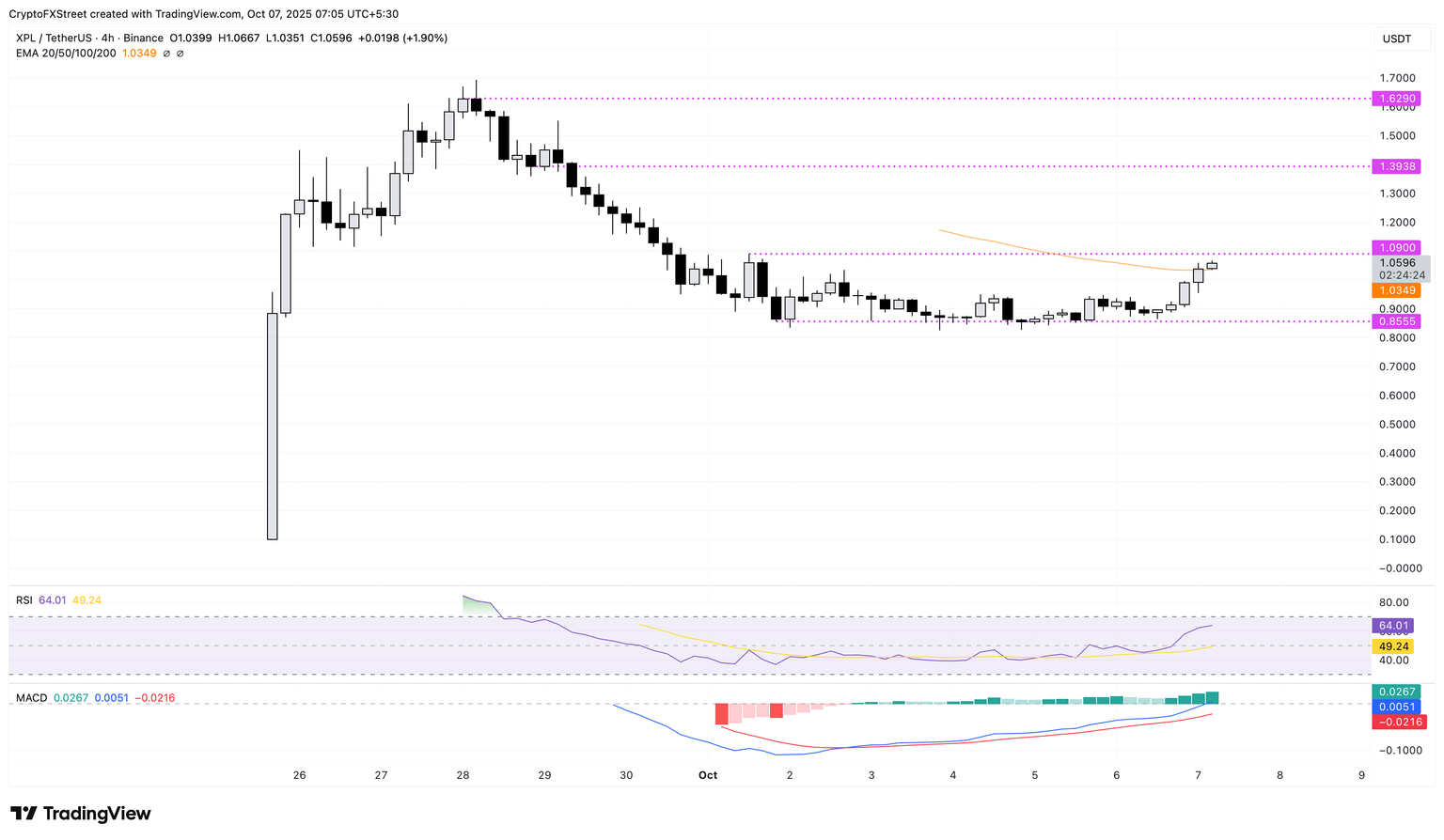 La reversión en XPL ha cruzado por encima del nivel psicológico de 1.00$ y se está acercando al nivel de 1.09$, marcado por el máximo del 1 de octubre. Un cierre decisivo por encima de este nivel podría extender la carrera de XPL a 1.39$, un nivel de soporte formado en el gráfico de 4 horas el 28 de septiembre.