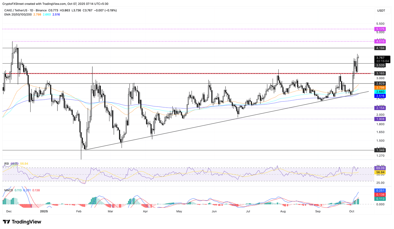 PancakeSwap se mantiene estable por encima de 3.75$ el martes, tras un salto de casi el 17% el lunes que formó una vela envolvente alcista. El rebote desde el nivel de 3.165$ apunta al nivel de 4.194$, marcado por el máximo del 9 de diciembre.