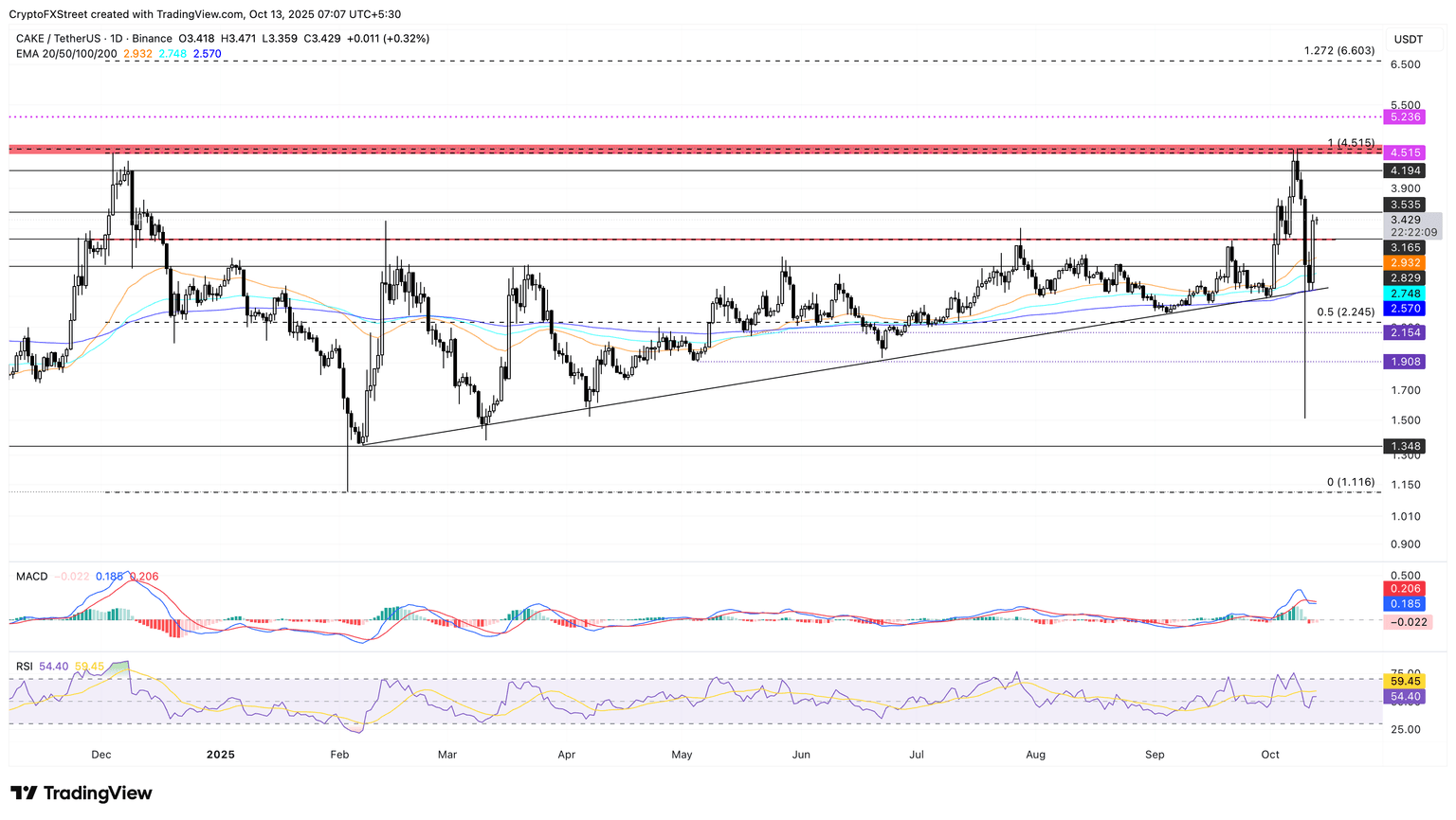 - PancakeSwap rebota desde su EMA de 200 días para resurgir por encima de 3.00$ tras el desplome del viernes.