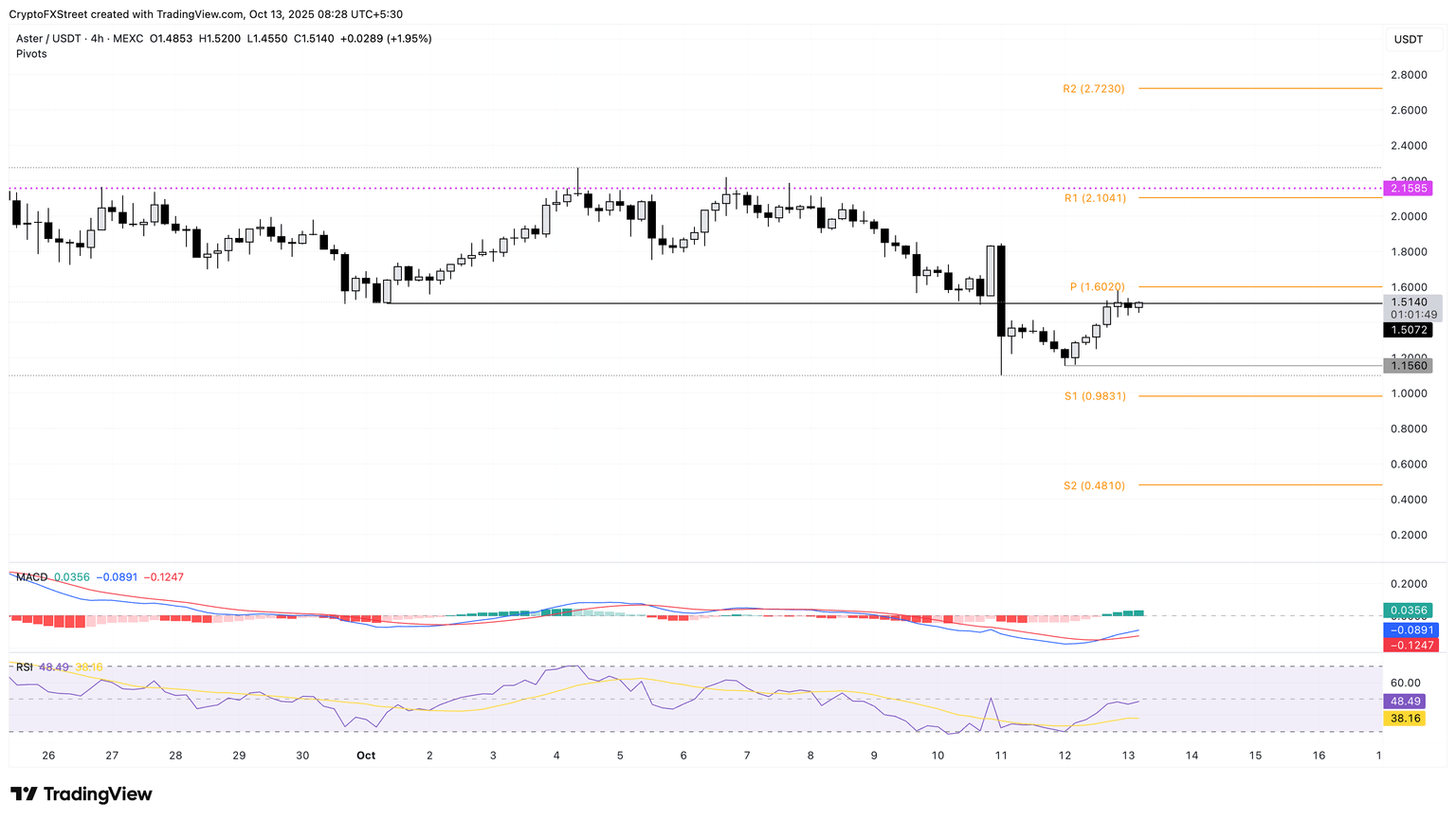 El token DEX respaldado por Binance se mantiene por encima de 1.50$ el lunes, con el nivel de Punto Pivote central en 1.60$ actuando como el obstáculo inmediato en el gráfico de 4 horas. Si ASTER cierra por encima de este nivel, podría desafiar el nivel de Punto Pivote R1 de 2.10$.