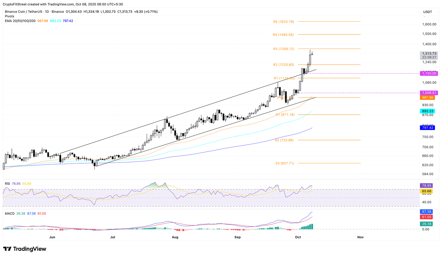 Mirando hacia abajo, un soporte clave para BNB se encuentra en el nivel de pivote R2 convertido en soporte en 1.220$.