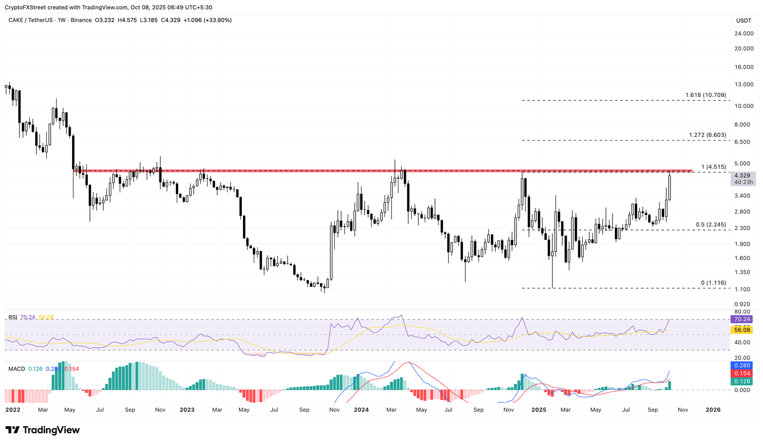 Gráfico de precios semanal de CAKE/USDT.