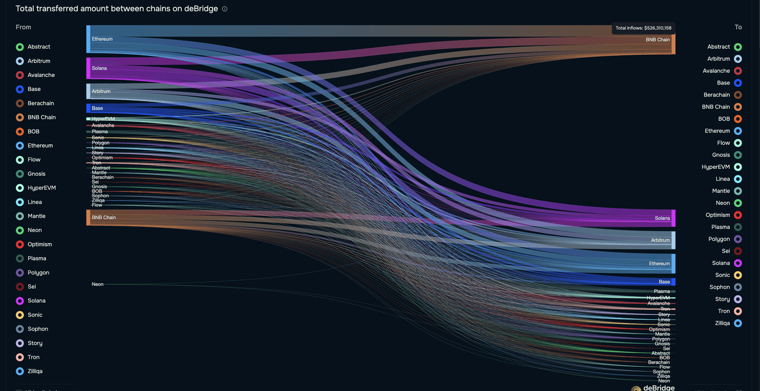 Los datos en cadena muestran un cambio significativo de capital de múltiples cadenas hacia la BNB Chain. deBridge revela que más de 526 millones de dólares en activos digitales se han trasladado a la BNB Chain en el último mes, principalmente desde Ethereum (ETH), Solana (SOL), Arbitrum (ARB) y otras cadenas. Esto indica un aumento en la liquidez y la demanda sobre la BNB Chain, lo que podría impulsar la demanda de su token nativo, BNB.