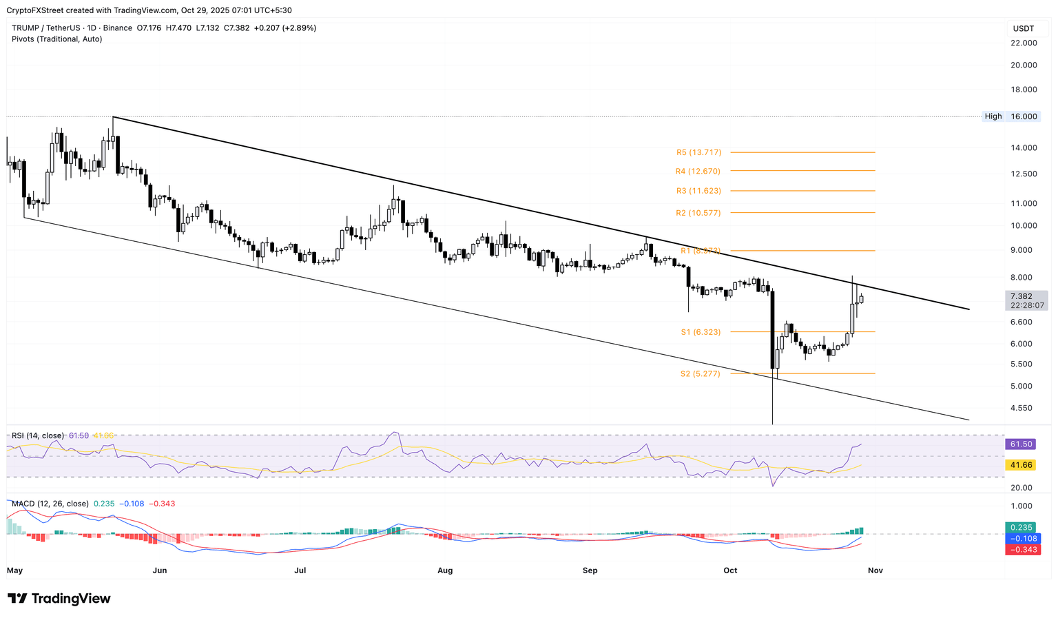 - El token oficial de Trump extiende su tendencia alcista por encima de 7$, apuntando a romper un canal descendente.