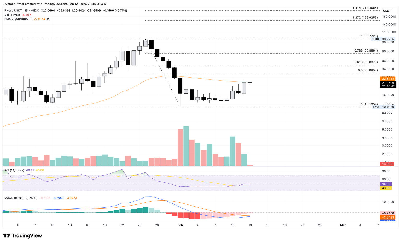 River se está negociando cerca de 21.50$ en el momento de la publicación el viernes, con resistencia en la media móvil exponencial (EMA) de 50 días en 22.59$ tras el repunte del 40% del jueves. La recuperación en forma de U en RIVER registra más del 70% de ganancias hasta ahora esta semana.