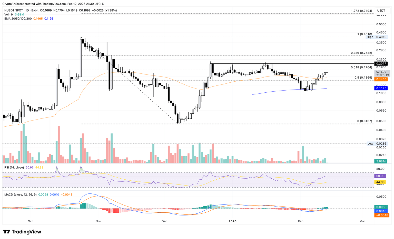 Humanity Protocol extendió su rebote desde la EMA de 200 días en 0.1125$ por séptimo día consecutivo, contabilizando más del 75% de ganancias. En el momento de escribir, H se está negociando por encima de 0.175$, cruzando la EMA de 50 días en 0.1464$.