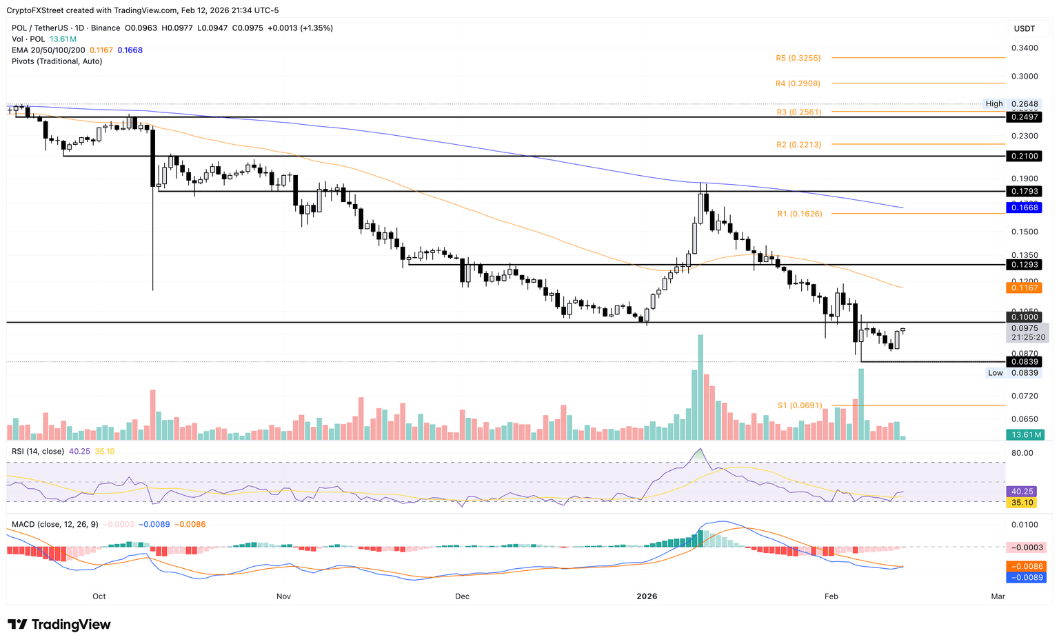 Por otro lado, el soporte crucial para Polygon sigue siendo el mínimo del 6 de febrero en 0.0839$ y una zona más profunda en el punto de pivote S1 en 0.0691$.