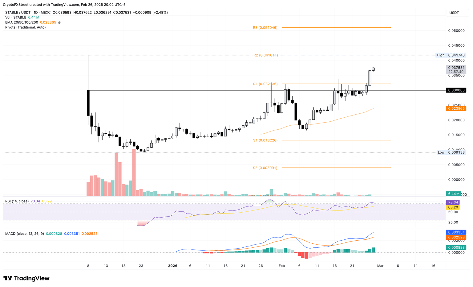 Stable sube más del 3% en el momento de la redacción el viernes, extendiendo las ganancias por cuarto día consecutivo. La recuperación en curso representa aproximadamente un 30% de ganancias hasta ahora esta semana y mantiene un sesgo alcista a corto plazo.