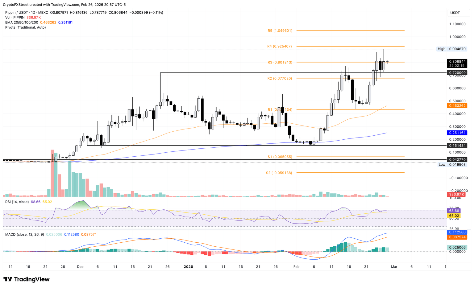 Pippin se negocia alrededor de 0.80$ en el momento de la redacción el viernes, manteniéndose estable después de un rebote del 9% el día anterior. La meme coin se está negociando cerca de niveles máximos históricos mientras prueba el Punto Pivote R3 en 0.8012$.