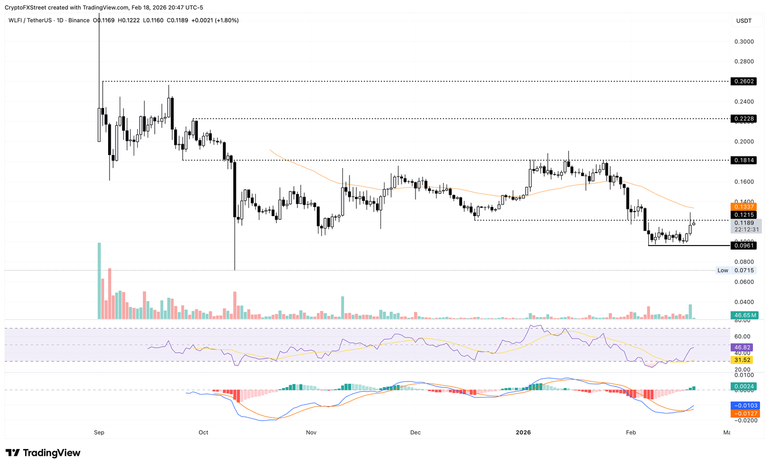 El token WLFI encuentra resistencia en 0.1215$, alineándose con el mínimo del 18 de diciembre. Un cierre decisivo por encima de este nivel extendería el rally de WLFI hasta la media móvil exponencial (EMA) de 50 días en 0.1337$.
