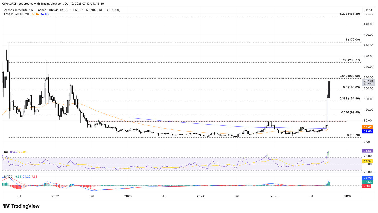 Si el rally de ZEC retrocede desde 235.92$, podría volver a probar el nivel de retroceso del 50% en 193.89$.