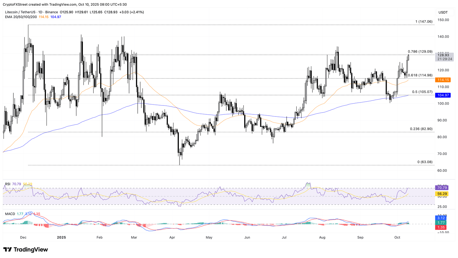 Avanzando en la tendencia alcista por tercer día consecutivo, Litecoin desafía el nivel de retroceso de Fibonacci del 78.6% en 129.09$, retrocedido desde el pico de 147.06$ del 5 de diciembre hasta el mínimo de 63.08$ del 7 de abril.