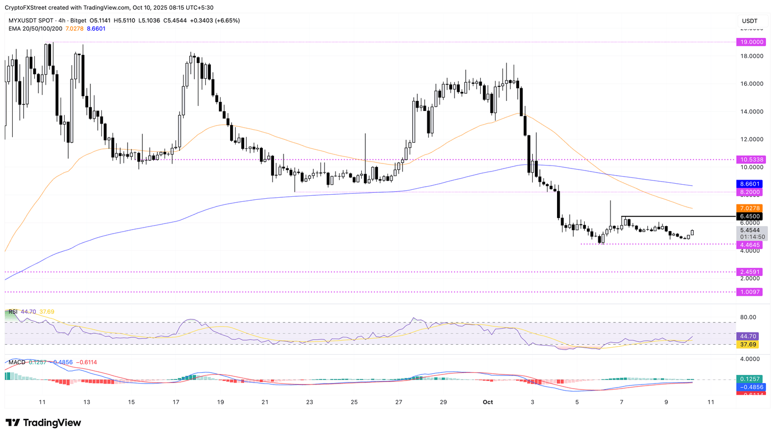 MYX Finance avanza un 6% en el momento de la redacción el viernes tras tres días consecutivos de pérdidas. La recuperación en MYX proviene de por encima del mínimo de 4.4645$ del lunes, extendiendo el rango de consolidación con el techo superior en 6.4500$.