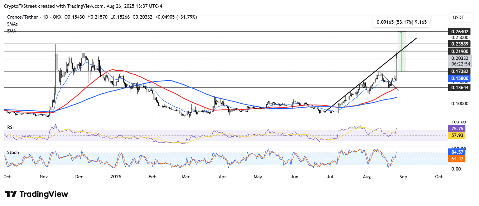 CRO se dispara un 30%, apunta a $0.26 tras validar un patrón técnico alcista