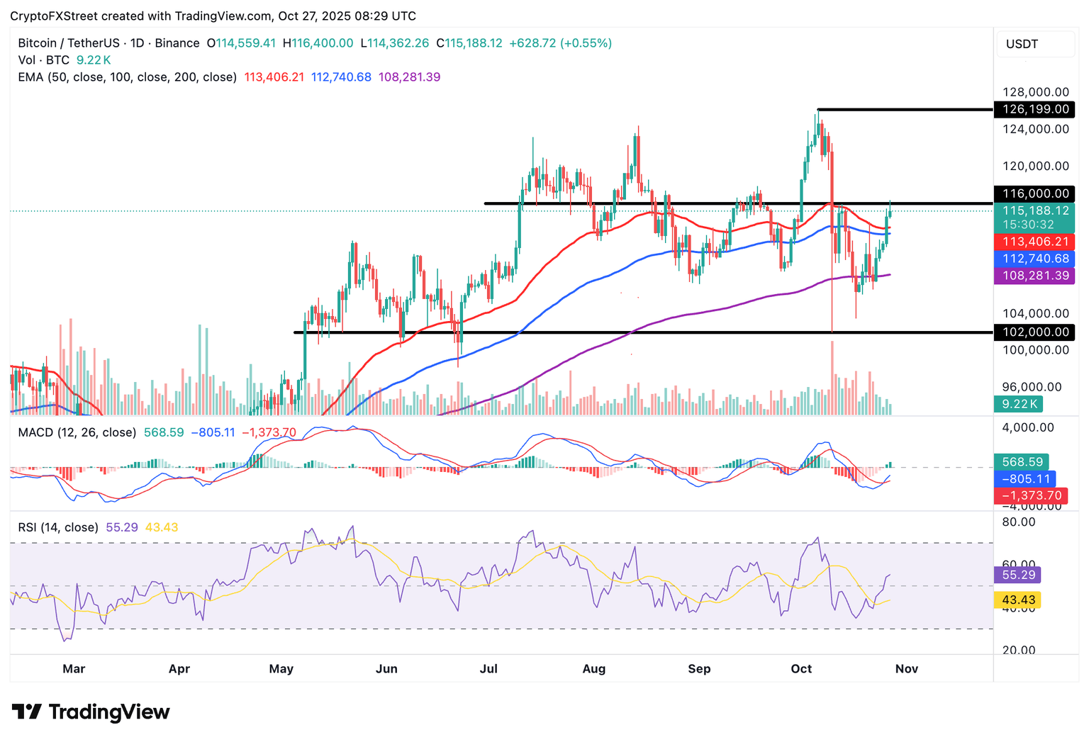 Un intento anterior de superar la resistencia de 116.000$ fracasó, llevando a una ligera reversión hacia el nivel de 115.000$. Aún así, con el indicador de Convergencia/Divergencia de Medias Móviles (MACD) manteniendo una señal de compra en el gráfico diario, el camino de menor resistencia podría seguir siendo al alza a corto plazo.