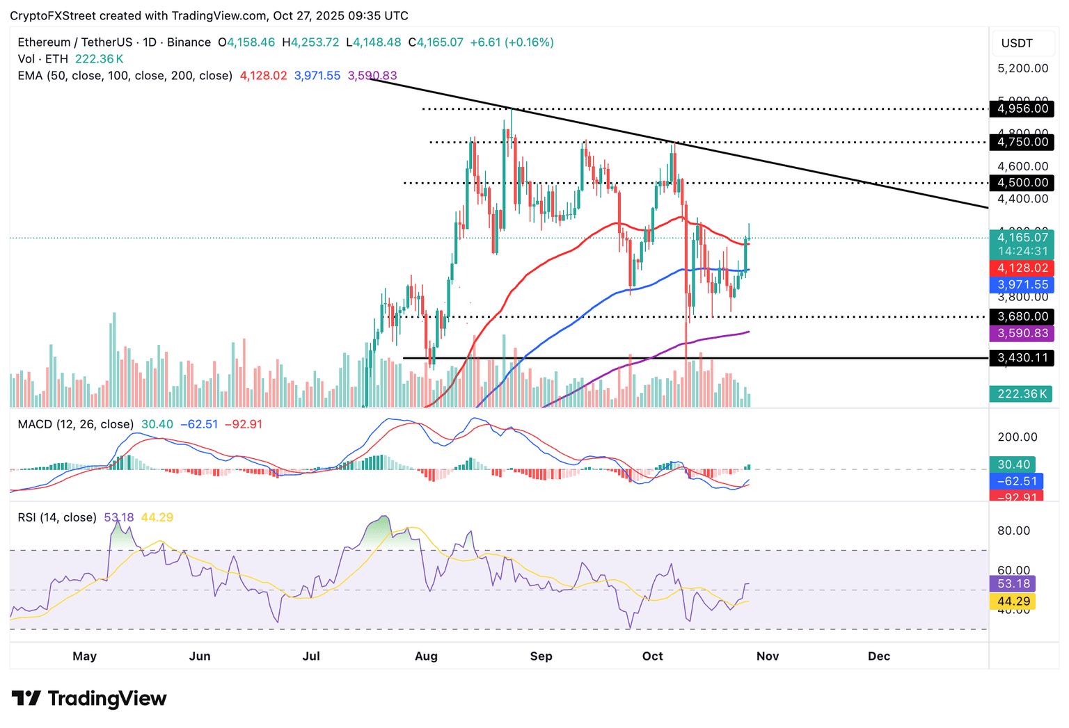 Ethereum está mayormente en manos alcistas, manteniéndose por encima del soporte de la EMA de 50 días en 4.128$ en el gráfico diario. Una señal de compra del indicador MACD, mantenida desde el domingo, apoya la perspectiva alcista.