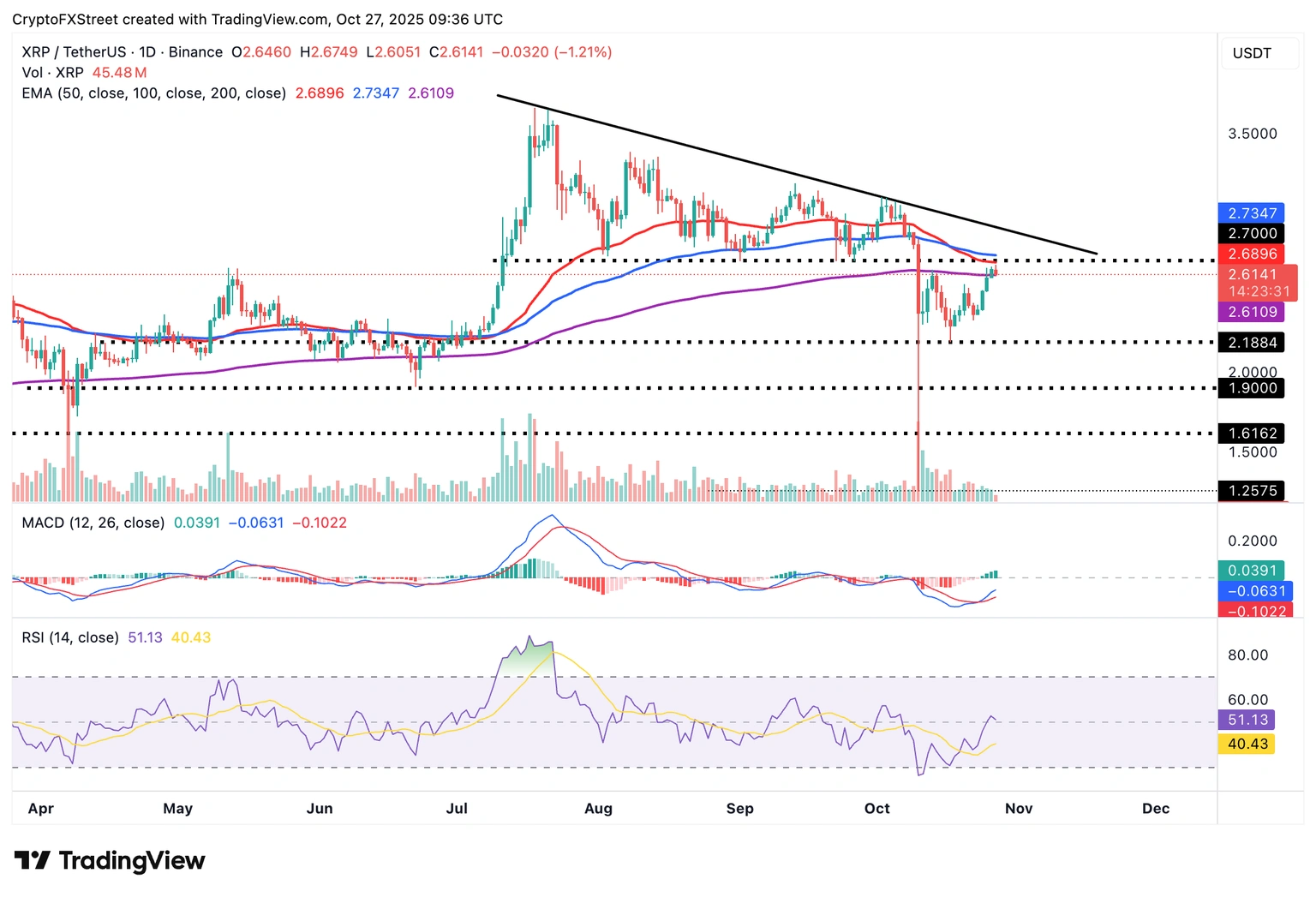 XRP se mantiene por encima del soporte de 2.61$ en el momento de escribir, destacando una mejora en la imagen técnica que probablemente sostenga la tendencia alcista a corto plazo.