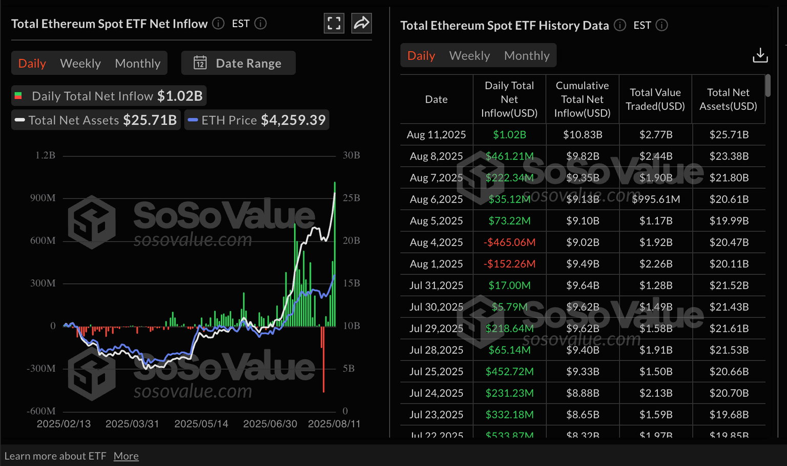 Datos del ETF de Ethereum al contado | Fuente: SoSoValue