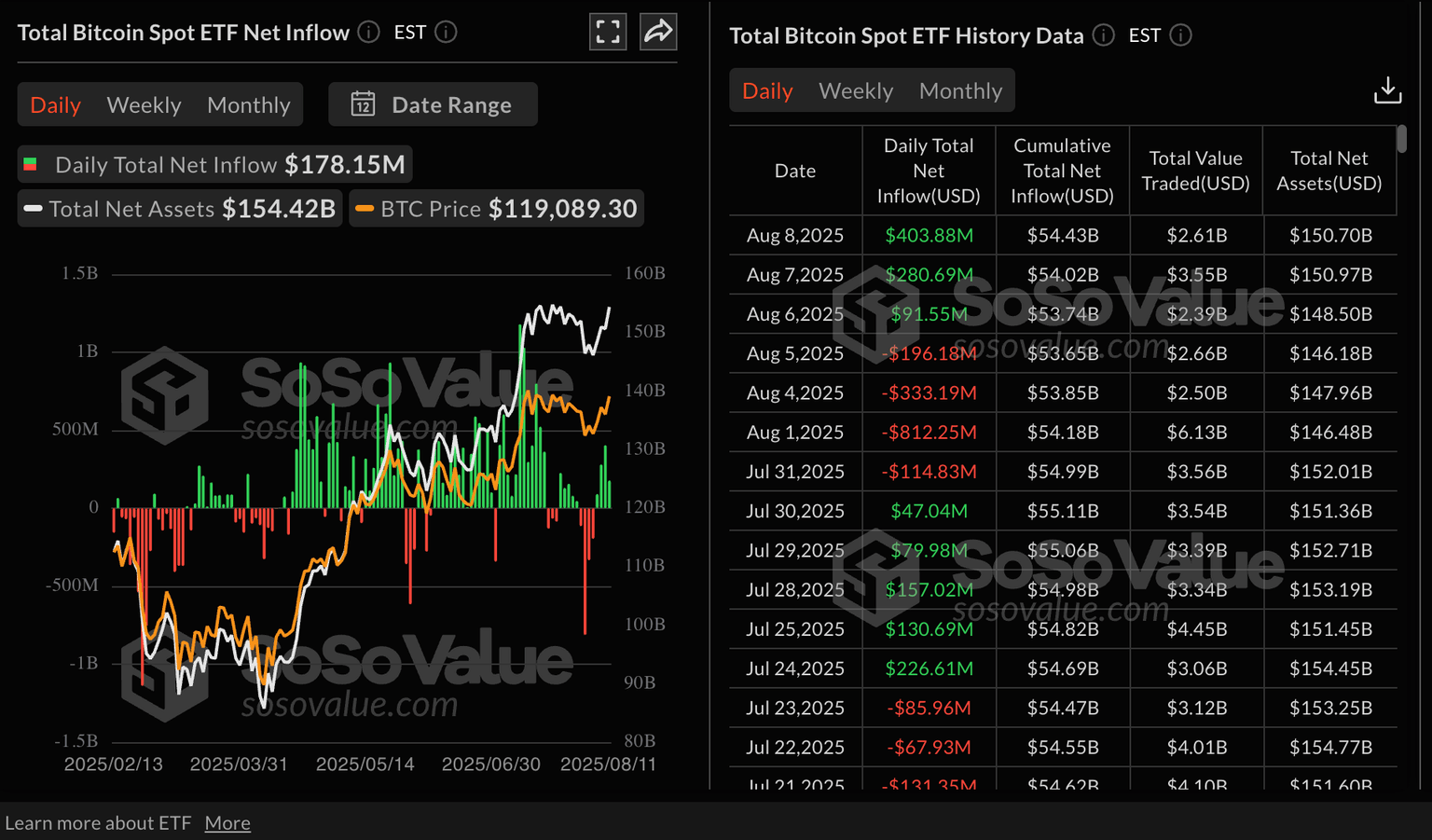 Datos del ETF de Bitcoin al contado | Fuente: SoSoValue