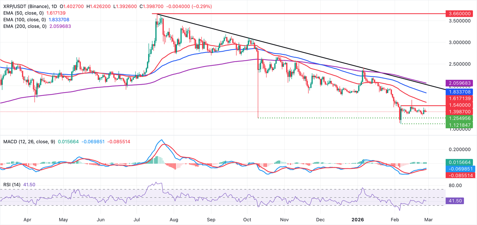 - XRP sigue cotizando dentro de una tendencia bajista general, como lo refleja la tendencia a la baja de todas las EMAs diarias principales.