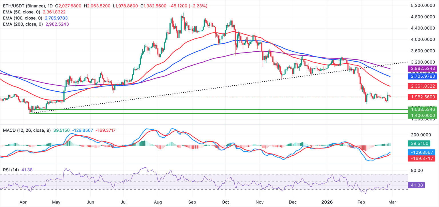 Ethereum se cotiza por debajo del nivel clave de 2.000$, afirmando un sesgo bajista a corto plazo mientras los inversores se vuelven cautelosamente alcistas después de que el token rebotara desde su mínimo semanal en 1.800$.