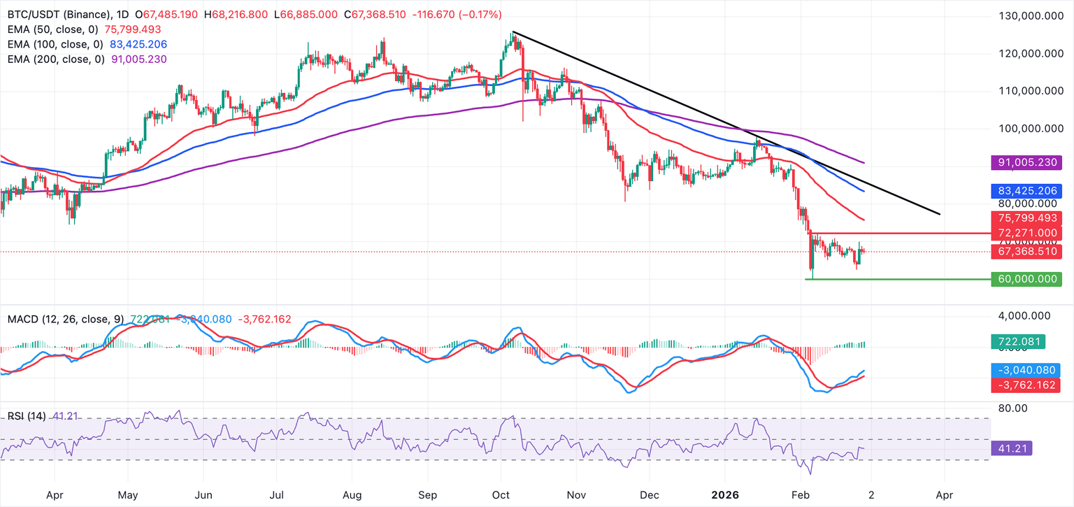 El Bitcoin se cotiza alrededor de 67.000$ después de que su ruptura intradía se detuviera ligeramente por encima de 68.000$. El precio se mantiene muy por debajo de la media móvil exponencial (EMA) de 50 días en 75.799$, la EMA de 100 días en 83.425$ y la EMA de 200 días en 91.005$. Las tres medias móviles están inclinándose hacia abajo, reforzando la tendencia bajista general.
