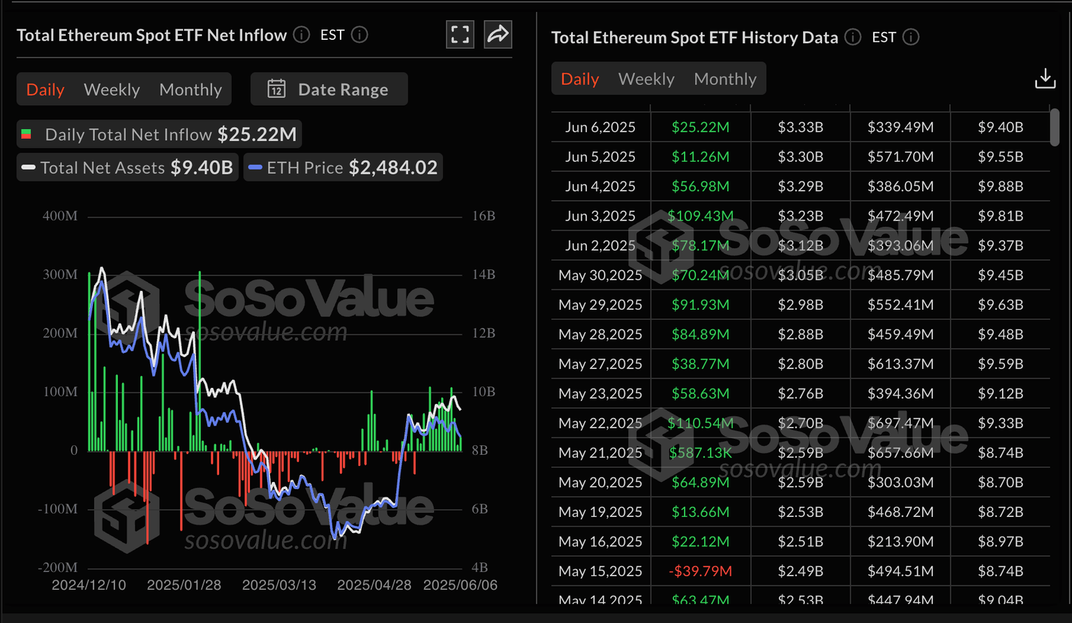 Por otro lado, los ETFs de Ethereum al contado continuaron registrando entradas netas la semana pasada, acumulando 281 millones de dólares. El volumen de entrada neta de 25 millones de dólares del viernes marcó 15 días consecutivos de flujos positivos, respaldando la creciente confianza de los inversores en el mayor token de contratos inteligentes tras la actualización de Pectra en mayo.
