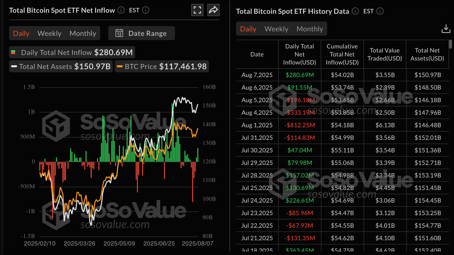 El interés en los fondos cotizados (ETFs) al contado del Bitcoin y Ethereum está regresando gradualmente, basado en las entradas constantes experimentadas en los últimos días. Los ETFs al contado de Bitcoin que operan en EE.UU. vieron una entrada neta diaria de 281 millones de dólares el jueves, marcando el segundo día consecutivo de entradas.