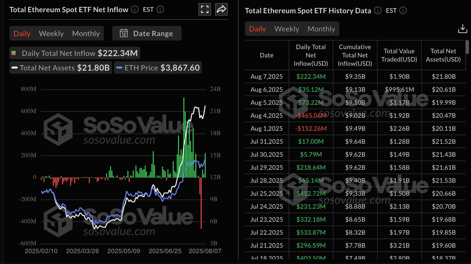 Los ETFs al contado de Ethereum marcaron el tercer día consecutivo de entradas con 222 millones de dólares fluyendo el jueves. El total acumulado de entradas netas promedia 9.35 mil millones de dólares, con activos netos alrededor de 21.8 mil millones de dólares.
