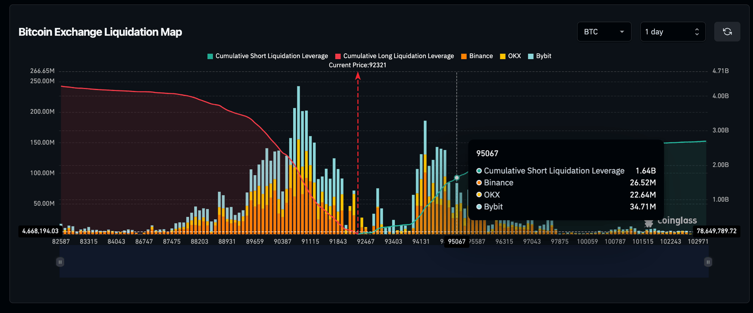 Sin embargo, una mirada más cercana al gráfico muestra que los bajistas han concentrado 1,64 mil millones de dólares en apalancamiento alrededor del nivel de resistencia de 95.000$, representando más del 65% de los contratos cortos activos totales.