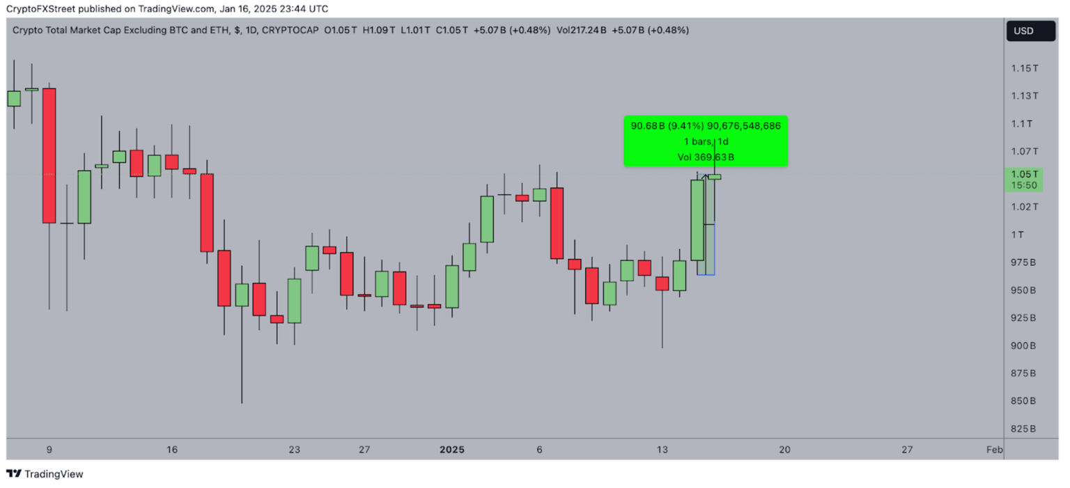 TOTAL3 de TradingView representa el crecimiento de la capitalización de mercado global de criptomonedas, excluyendo Bitcoin y Ethereum. El gráfico anterior muestra que la capitalización de mercado de altcoins creció en 88 mil millones de dólares el jueves, mientras que BTC y ETH se estancaron.