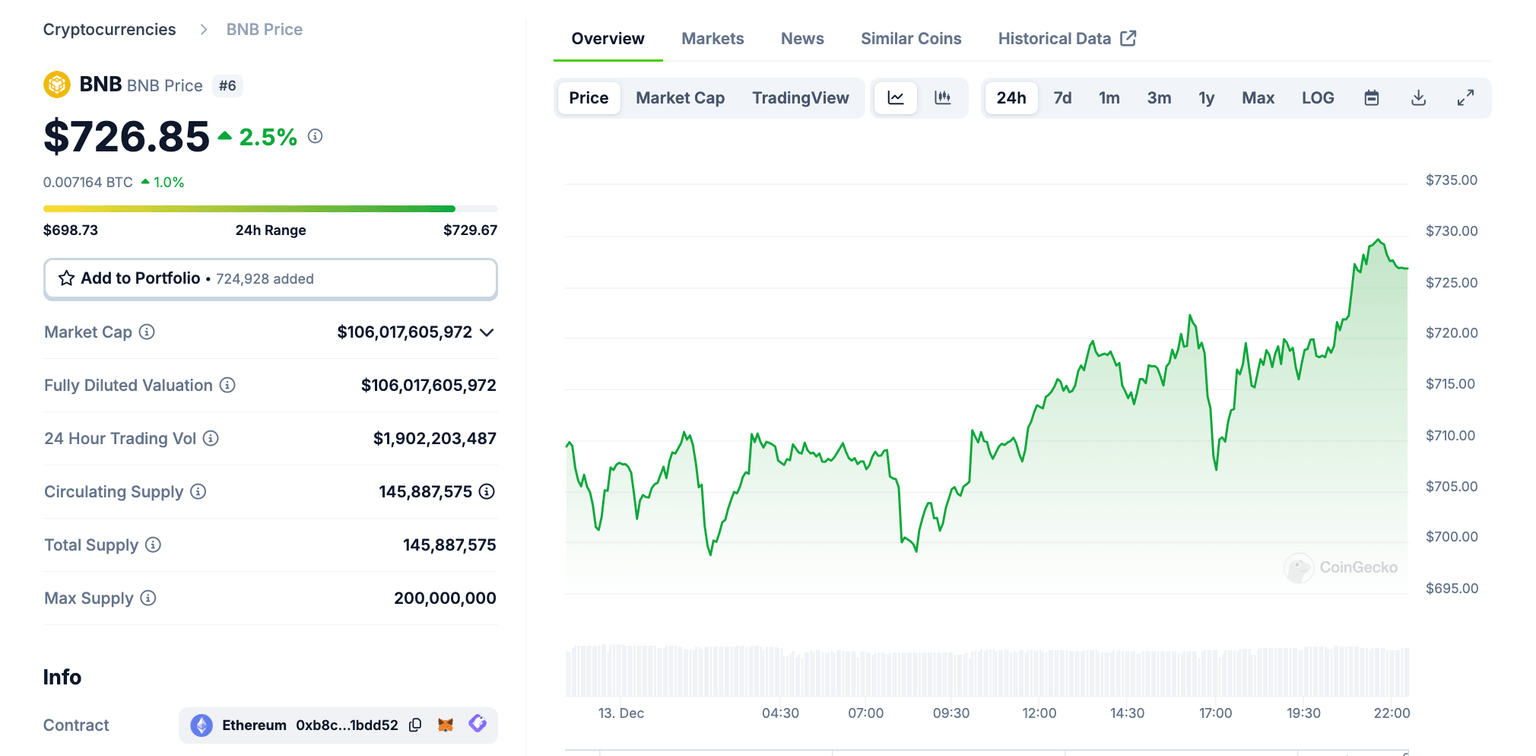 Acción del precio de Binance Coin (BNB), 13 de diciembre de 2024.