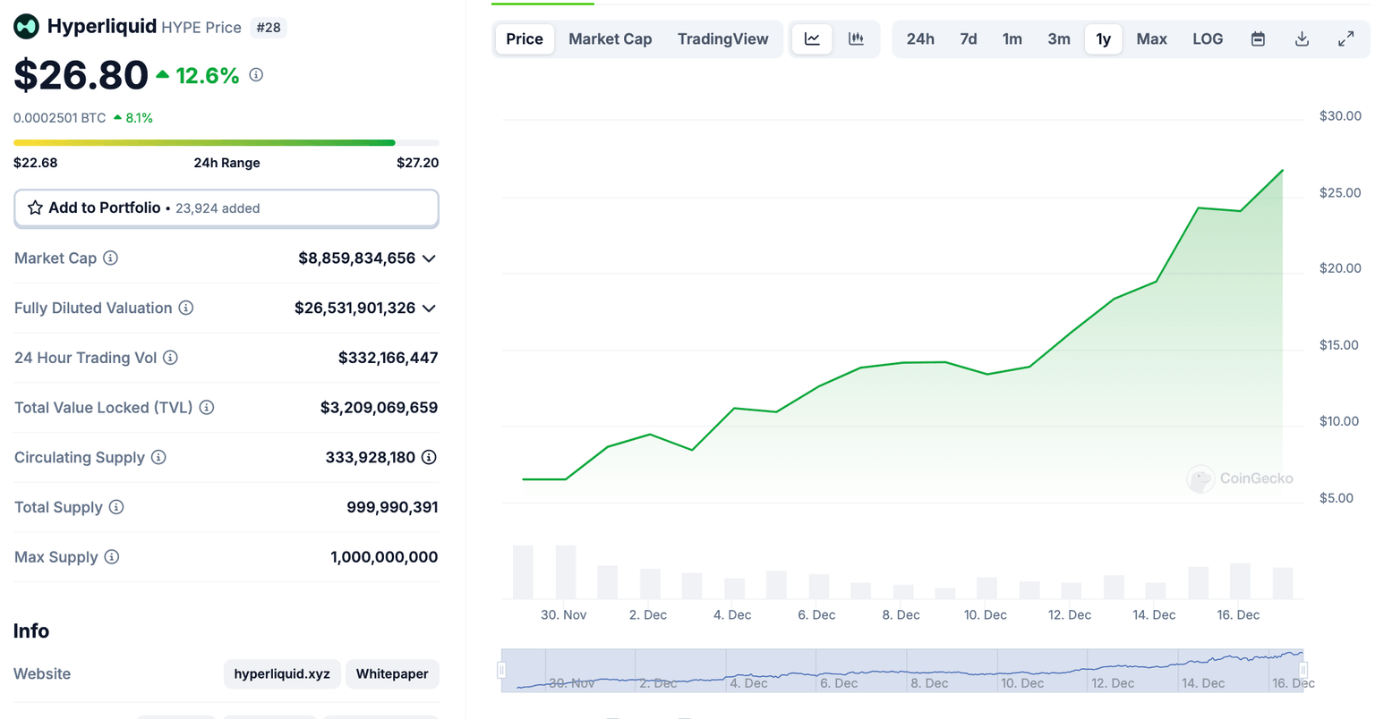 Hyperliquid es una plataforma descentralizado recién lanzada que ganó popularidad después de un airdrop de 1.000 millones de dólares ejecutado el 2 de diciembre. La demanda del token HYPE sigue aumentando a medida que los grandes inversores se inclinan cada vez más hacia el sector DeFi mientras la Fed de EE.UU. se posiciona para reducir aún más las tasas en los activos de renta fija a finales de esta semana.